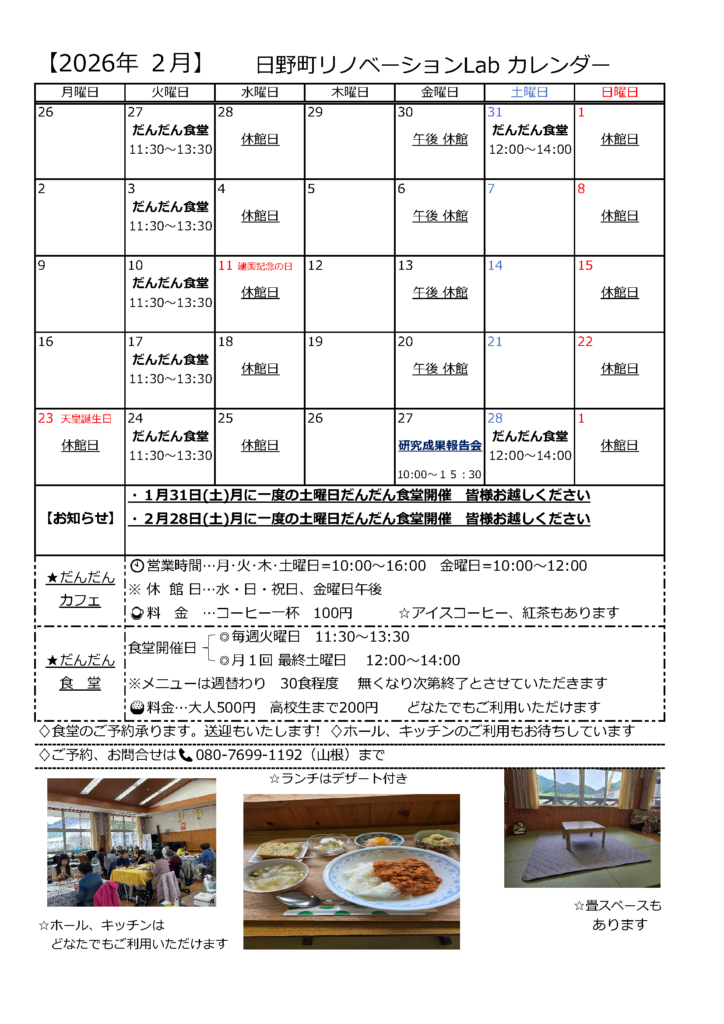 | 2日 (木) | – | 日野町リノベーションラボ 研究成果発表会 | 旧黒坂小学校 |